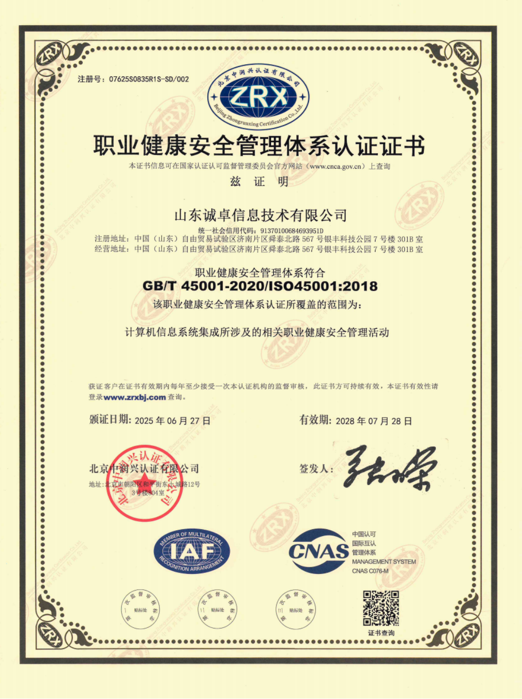 ISO45001职业健康管理体系认证证书
