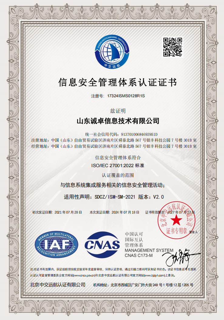 ISO27001信息安全管理体系认证证书