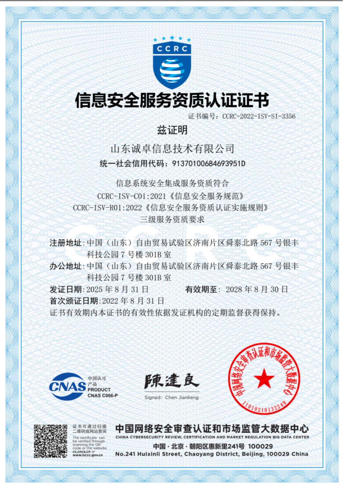 信息安全服务资质认证证书